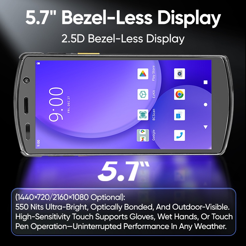 Écran 2.5D sans bordures (1440×720/2160×1080 en option) : ultra-lumineux (550 nits), collage optique et lisible en extérieur. Tactile haute sensibilité compatible avec les gants, les mains mouillées et l’utilisation d’un stylet ; performances optimales par tous les temps.